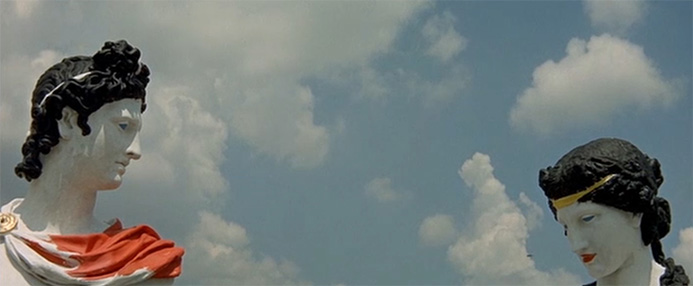 Three moments shape the film’s mid-century perspective on color—the development of cinematic technologies, the twentieth century’s redeployment of antiquity, and antiquity itself. Among the best known of Godard’s critiques of the commercial film industry, Contempt adapts Alberto Moravia’s Italian “vulgar and pretty pulp fiction” Il disprezzo (Contempt, 1954) to tell the story of an unraveling marriage—of Camille Javal (Brigitte Bardot) and Paul Javal (Michel Piccoli)—set against the narrative backdrop of a producer, scriptwriter, and director (Fritz Lang played by Fritz Lang) struggling to make a Technicolor movie of Homer’s Odyssey set in the Cinnecittá Studios in Rome (“the modern world; the West”) and in Capri (“the ancient world, nature before civilization and its neuroses”).8 In this film within the film—Lang’s Odyssey—human actors made-up in vivid colors play Odysseus, Penelope, a centaur, and a Siren, while painted plaster casts of ancient statues perform both as the Olympian gods Poseidon, Athena, and Aphrodite and as the poet Homer (figs. 1–3). Framed by landscapes with their own bright colors, the statues of Lang’s Odyssey propose a relationship between figure, ground, and sky that technologies of reproduction often disconnect but that were also important to the visual reception of such objects in antiquity.9 Lang’s Odyssey, thus, serves as a set piece for the imbrication of coloristic media. Training several thematic lenses on the role of color in the film and its classical source material—translation across languages, media, and space; cast production as a locus for the erasure of color across time; and the contingencies of color in theory and practice—lays bare Contempt’s intervention in the history of color.