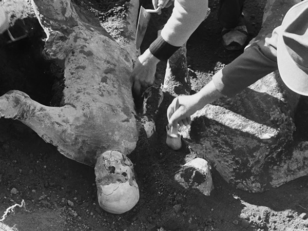 Deep into Rossellini’s film, when the central couple, Alex and Catherine Joyce, have agreed to divorce, the caretaker of their Uncle Homer’s villa appears to take them to Pompeii to see the archaeologists “make a cast of the hollow space that has been left in the lava by a human body!”50 At the site, they watch this process of casting the space left in the ground by incinerated corpses. In a typical excavation, the archaeological reveal involves scraping away earth to expose ancient objects; here the archaeologists’ trowels and brushes reveal, instead, two newly made white plaster forms. These casts solidify the empty spaces once filled with bodily flesh (fig. 11). Gendered and coupled by the heteronormative imagination of the archaeologists who identify the two emerging forms as a man and a woman, perhaps a husband and wife, this macabre sight overwhelms Catherine, who rushes off in tears followed by Alex. Together, they thread their way through the site, and the camera follows them over intact stone roads and past remnants of painted walls. The same eruption of Vesuvius that killed so many people also preserved the vivid colors of Pompeii, but these are muted by Rossellini’s black-and-white film and by the monochrome plaster casts that stand in for the dead. Godard’s vibrantly painted casts of the gods in Lang’s Odyssey, in contrast, transform the unpainted white plaster casts of Pompeii’s dead in Rossellini’s film, intervening not only in the traditional, fossilized picture of classical antiquity but also in the picture of that antiquity in past films.