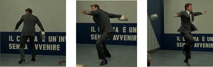 In Journey to Italy, the museum guide identifies one of the statues that Catherine (played by Ingrid Bergman) encounters from the villa of Herculaneum as “a discus-thrower. A Greek.”52 This misattribution—the statue depicts a runner—allows Rossellini to contrast the polychrome bronze statue in his film with monochrome white marble and plaster iterations of a lost bronze discus-thrower (Discobolus) sculpted by the Greek artist Myron.53 Godard responds to Rossellini’s Greek discus-thrower in living color, staged not through painted casts but through the body of the American producer Jeremy Prokosch (fig. 12). Unhappy with the direction of Lang’s adaptation, Jeremy leaps from his chair in the screening room and knocks the stacked reels of film to the ground. Grabbing one reel from the floor, he swings it discus-style toward the seating area and lets it fly. In the face of Jeremy’s tantrum, Lang comments dryly: “Finally, you get a feel for Greek culture.”54 Godard casts this agent of Hollywood and global capitalism as the discus-thrower, producing an embodied iteration of the famous statue that draws on an earlier reference likely active for both Rossellini and him.