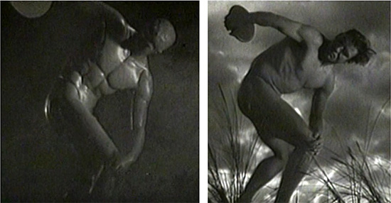 In her black-and-white propaganda film documenting the 1936 Olympic games in Berlin, Olympia (1938), Leni Riefenstahl staged a naked male statue of a discus-thrower turning into the body of Hitler’s Aryan athlete (Erwin Huber), mobilizing myths of philhellenism, mimesis, and idealized naturalism to move from marble statue to living body in a frame (fig. 13).55 The monochrome white marble Roman statue in Riefenstahl’s film reproduced an earlier ancient Greek bronze statue by Myron that is no longer extant but that was reproduced repeatedly in antiquity. Riefenstahl filmed a plaster cast of the Discobolus already in Germany, releasing Olympia just a month before Hitler purchased an ancient Roman marble copy, the Lancellotti Discobolus, in Rome on May 18, 1938, to display it in the Munich Glyptothek.56 Repatriated after the defeat of the Third Reich, the statue remains on display in the Palazzo Massimo (126371) in Rome. In contrast to the white plaster staging of Riefenstahl’s film, Rossellini stages Bergman encountering a Roman polychrome bronze discuss-thrower with inlaid eyes. Having already undermined Riefenstahl’s purity aesthetics through the vibrant colors of his painted Olympian gods, Godard repurposes Riefenstahl’s German Olympian and presents Jeremy, an embodiment of Hollywood’s complicity in globalized capitalism, mimicking the pose and movements of Riefenstahl’s earlier icon of fascism.