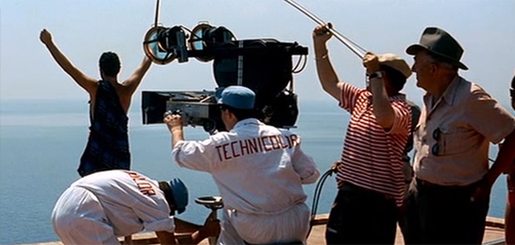 Although shot on Eastmancolor, the credits for Lang’s Odyssey identify Technicolor as its color technology, and crew members wear jumpsuits emblazoned with the word “Technicolor” on the back, staging a contrast between the newer Eastmancolor of the film and the earlier dominant color three-strip color technology. This staging of Lang’s Odyssey as if in Technicolor performs a passage in Moravia’s novel in which the playwright laments selling out to write “a masquerade in technicolor.”67 Of Technicolor’s challenges, Contempt’s cinematographer Raoul Coutard reflected: “It’s when he is working with colour film that the cameraman is most aware of the fact that no film stock is as sensitive as the human eye. The problem comes from the fact that any number of techniques and working practices were developed for work with early colour stock, such as Technicolor, which was not very flexible.”68 The juxtaposition of the Technicolor of Lang’s Odyssey and the Eastmancolor on which Godard shot Contempt establishes a framework of technology’s inevitable, relentless obsolescence, color’s contingency, and capital’s capture of creative control.