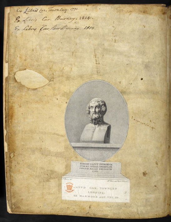 - 58 In addition to Homer’s bust and Hadrian’s Discobolus, Charles Townley also collected a copy of the Iliad written down on parchment around 1059 CE and filled with centuries of marginalia into which he inserted both an engraving of his own portrait and an engraving of the bust of Homer on the recto, British Library, Burney MS 86 (see fig. 4).