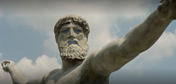 A statue painted with a dark green patina and bright blue across its eye sockets and lips—two areas that would once have been polychrome on the bronze statue it reproduces—plays the sea god Poseidon (Neptune; fig. 6). The camera pans so that the statue seems to rotate toward the camera; its right hand is drawn back as if to throw an absent weapon, while its left arm extends forward, situating the audience as the god’s target. This painted cast cites an extant bronze statue discovered in 1926 in waters near Cape Artemision that is now in the National Archaeological Museum in Athens (NAM X15161). The narrator of Lang’s Odyssey identifies the statue, “And that’s Neptune, his [Odysseus’s] mortal enemy,” taking a position in debates over whether the statue depicts Zeus or Poseidon. While the film uses Poseidon’s Roman name, Neptune, highlighting one aspect of translation from Greek to Roman culture and language, the cast playing the god in Lang’s Odyssey cites a statue with strong ties to ancient and modern Greece. In 1953, a decade before Godard shot Contempt, the bronze was popular enough that the Greek government gave a bronze cast of it to the United Nations in New York (UNNY129G), where it remains on view in the lobby.27 Although now well known, due to its discovery in the early twentieth century, this statue did not shape eighteenth- and nineteenth-century ideas about ancient Greek sculpture or populate historical monochrome cast collections, an absence that Godard’s choice to cast this twentieth-century discovery in Lang’s Odyssey underscores.