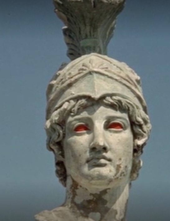 The painted cast performing as Athena (Minerva) receives similar treatment without the painted patina (fig. 7). Its vacant eye sockets and lips are painted not blue but red, a distinction that marks Athena and Poseidon’s opposing sides in the Trojan War and throughout Odysseus’s long journey home following the war’s end. This Athena evokes a Roman marble statue of the goddess now in Paris (Louvre Ma 130) that may also cite an earlier bronze iteration with intact inlaid eyes found in 1959 in the Piraeus (Piraeus Archaeological Museum 4646).28 Ancient artists produced many different statues of Athena, most famously the Athena Parthenos, a colossal gold and ivory statue that once stood inside the Parthenon in Athens, images of which were cited widely.29 In that sense, reproducing a painted statue of Athena in Lang’s Odyssey both fulfills narrative demands and also invokes deep histories of reproduction and transmedial citation.