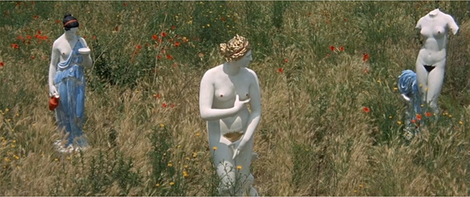 Despite the abundance of material colors used by artists in antiquity, much has been stripped away by time, wear, and technologies of reproduction, such as casts, prints, black-and-white photography, and film. These reproductions often circulate more widely and with fewer polychrome particulars than the objects that they reproduce. Paint on sculpture in particular has remained the most controversial locus of debates over color and classical antiquity. In contrast to reproductive processes that strip away color, Godard adds it back through filters, pigments, makeup, and shots tracking across land and sea. By staging these reproductions of polychrome ancient sculptures and brightly made-up actors, Godard refuses the monochrome ideal of the classical past that audiences might have expected and that earlier films had constructed. Although by the 1960s changes in film technologies had made color rather than black-and-white film the norm, in what was only his second color film Godard uses color on materials and objects that audiences expected to see in black and white. Refusing the trope of naturalism, Godard’s color does not make his statues more lifelike but makes his actors more like painted statues.25 Color’s instability—pictured through the partial coverage of each statue—plays into Godard’s long-standing engagement with an aesthetics of ruination, one that connects to the related instability of color in film.